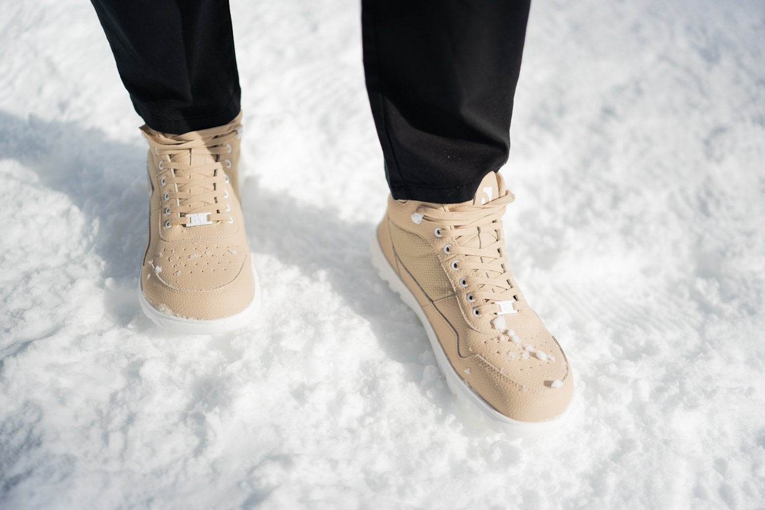 Los zapatos descalzos Barebarics UrbanEdge en beige son ideales para el invierno, con una membrana impermeable que protege contra agua y nieve. La tecnología Primaloft mantiene los pies calientes, mientras que la suela PowerGrip ofrece un agarre seguro. Con estas características, son perfectos para terrenos difíciles y condiciones climáticas cambiantes.